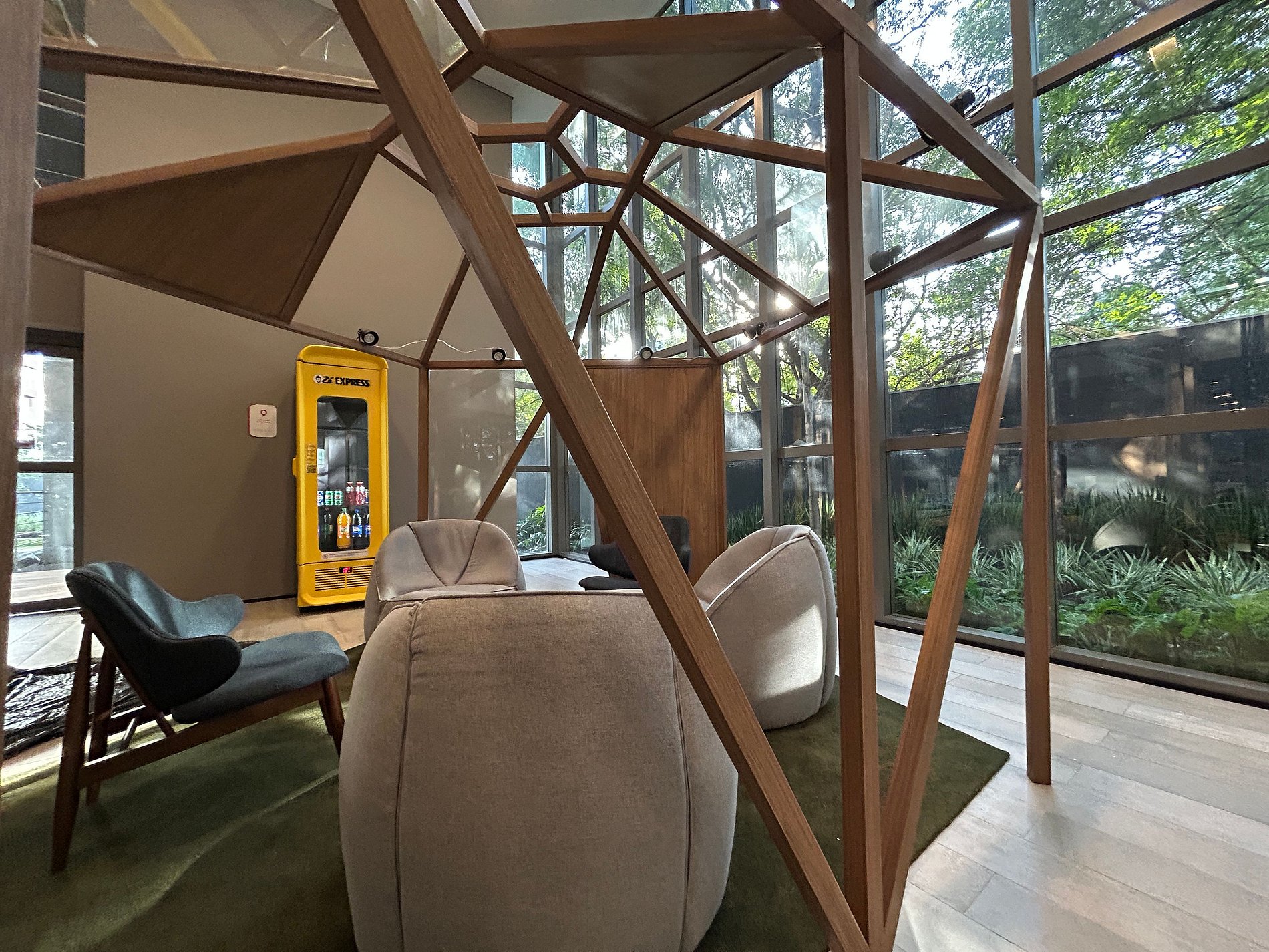 - Espaço de coworking com estação de trabalho e cabines privativas para reuniões