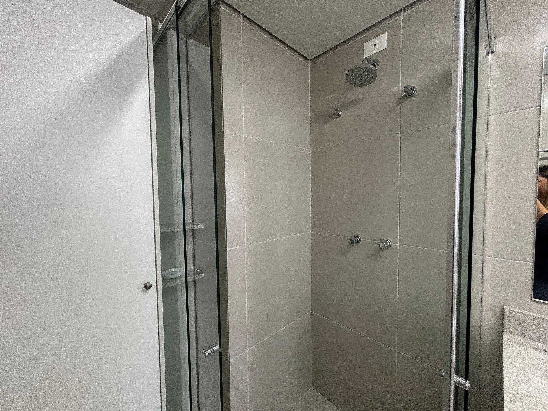 O banheiro é amplo e bem iluminado, garantindo conforto e praticidade durante toda a estadia.