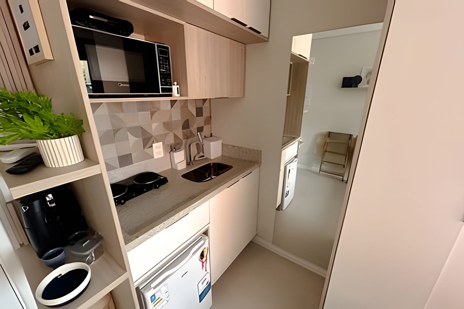 A cozinha é totalmente equipada, com frigobar, micro-ondas, cooktop de duas bocas e todos os utensílios necessários — tudo pronto para você preparar desde lanches rápidos até refeições completas.