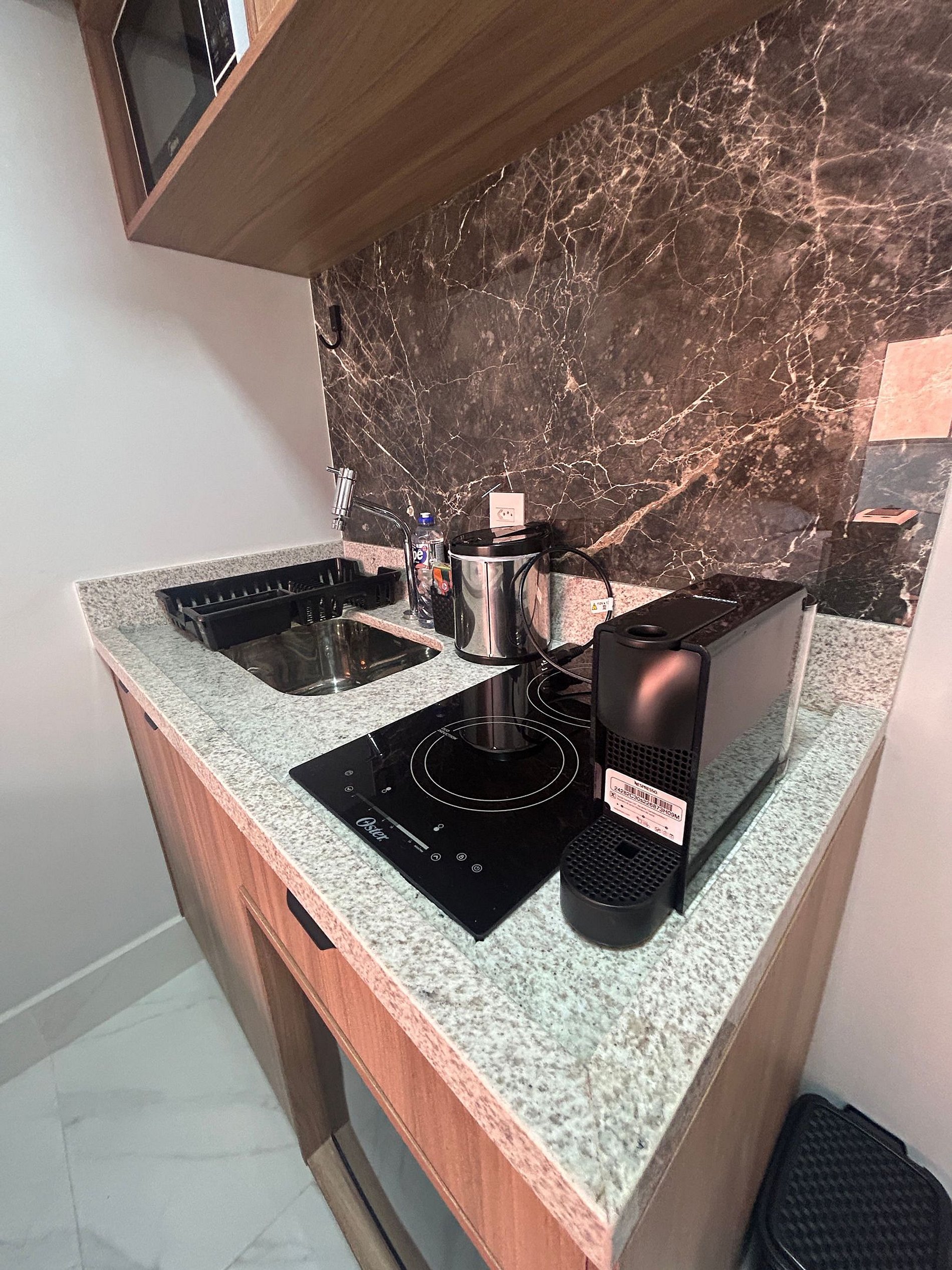 O Studio conta com uma cozinha equipada com fogão, frigobar, Airfryer e utensílios básicos, como talheres e panelas.