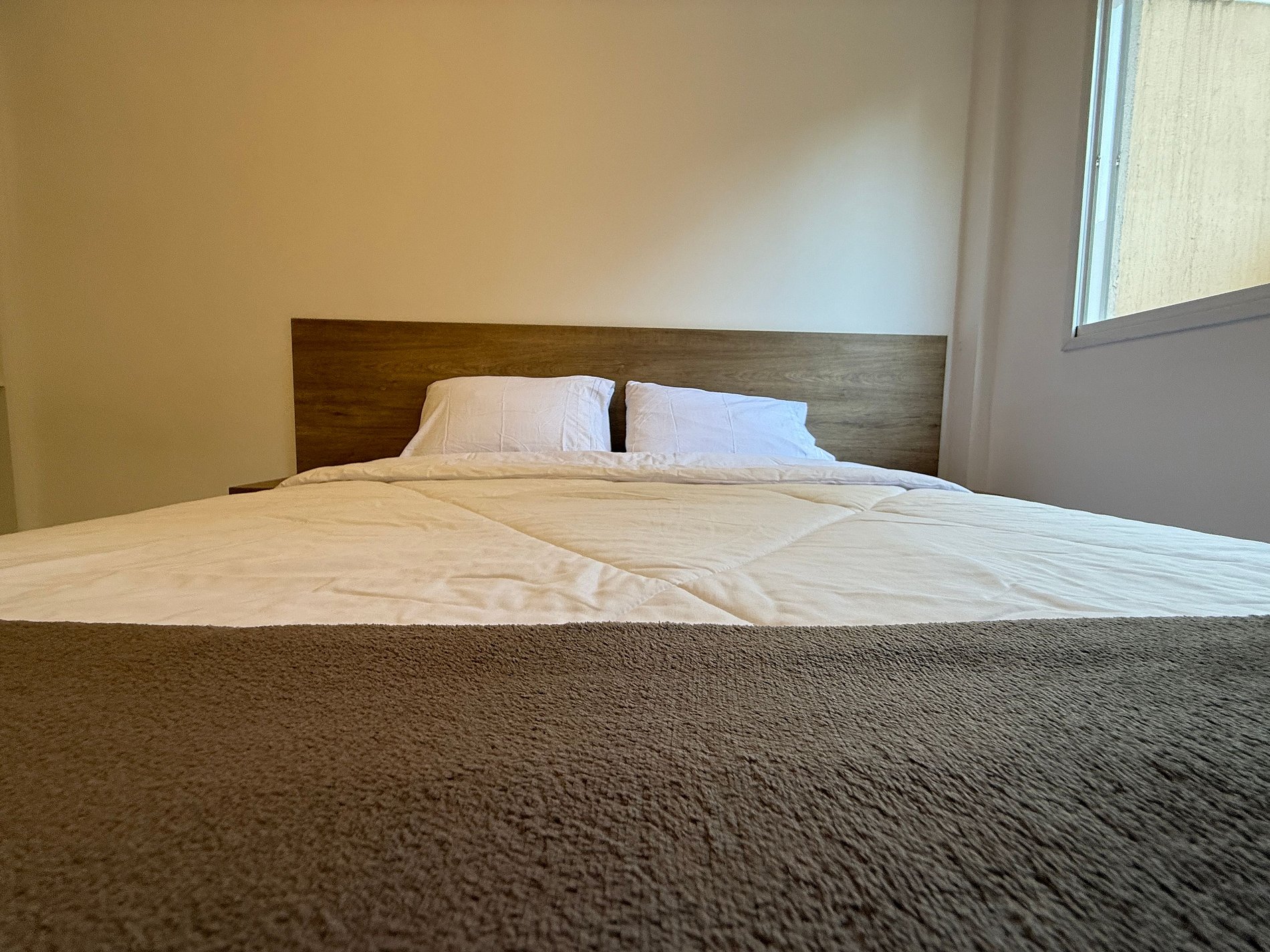 O apartamento conta com uma sala aconchegante com sofá, perfeita para relaxar, assistir TV ou trabalhar com tranquilidade. A cozinha está totalmente equipada com fogão, geladeira, micro-ondas, utensílios básicos e uma mesa para refeições, permitindo que você prepare desde um lanche rápido até uma refeição completa. Os dois quartos são bem iluminados e arejados, com camas confortáveis e armários para guardar seus pertences. O banheiro é funcional, com chuveiro quente e boa pressão de água.
